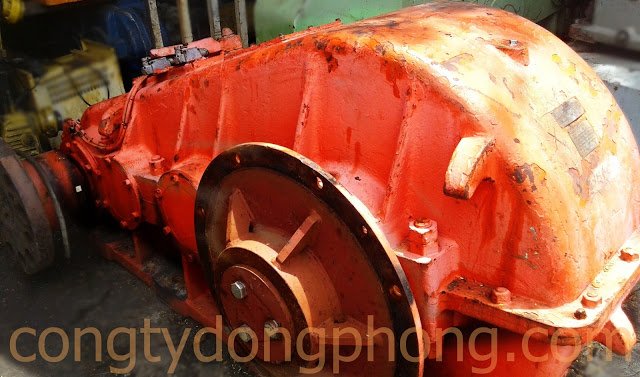 mô tơ giảm tốc cũ 5hp 1/45, công suất 3.7kw, vòng quay 32 vòng/ phút, điện áp 380v, 3 pha, chân đế.
